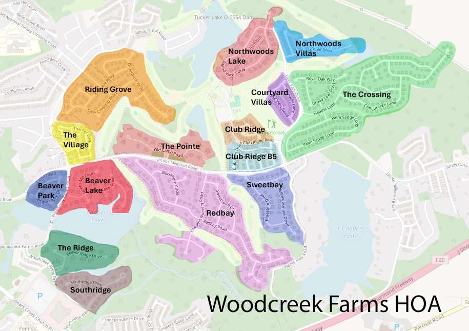 Woodcreek Farms has eight gated communities including Beaver Park, Courtyard Villas, Northwoods Lake, Northwoods Villas, The Point, The Ridge, Southridge, and Sweetbay.